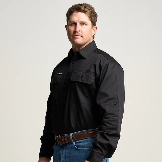 OBCMWS001-BLK KILCOY | Mens Half Button Long Sleeve Work Shirt - Black